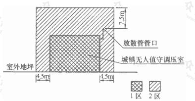 調壓室內部的空間為1區(qū)。調壓室建筑物外壁4.5m內,屋頂(以放散管管口計)以上7.5m內的范圍為2區(qū)。