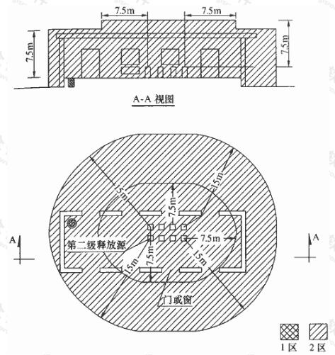 2 與爆炸危險(xiǎn)建筑相鄰,并采用不燃燒體實(shí)體墻隔開的無(wú)釋放源建筑,其門、窗位于爆炸危險(xiǎn)區(qū)域內(nèi)時(shí)劃為2區(qū);