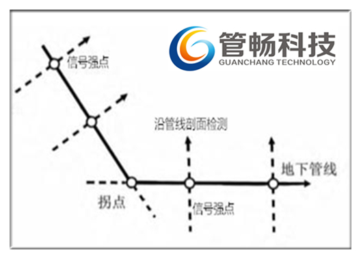 在探測過程中,如果沿管道走向探測時,聲音突然減弱,這時可在此點與上一個點之間詳細監(jiān)聽,找出聲音最強點即為彎頭所在位置(一般情況下由于聲波在管道彎頭處與管壁摩擦加劇,因此信號比直線位置點信號更強)。同時可以回到上一個點以此點為圓心,以3米為半徑沿圓周線盲找,在找出信號最強點后,再以此點為圓心沿圓周,找出另一個信號較強的位置點,將這兩點連成一條直線。在確定兩條管線走向后,將這兩條管線延伸交匯于一點,該點即可判定為管線的拐點。在實際探測過程中,可以結(jié)合兩種方法綜合判斷。此外如果在沿圓周盲探時,沒有遇到信號強點,可擴大探測半徑尋找信號,如果確定無法找到信號源,可判定此處為管道終點,此時可以在上個點沿走向詳查,找出信號最大點即為管道終點。