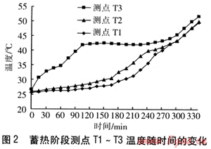 工作電壓為8V,余熱熱源溫度為32℃時(shí),蓄熱階段測(cè)點(diǎn)T1~T3溫度隨時(shí)間的變化見(jiàn)圖2。由圖2可知,在蓄熱開(kāi)始時(shí)期,測(cè)點(diǎn)T3處的石蠟吸收熱量后溫度有明顯的升高。在達(dá)到相變溫度(35℃)前,石蠟主要呈固態(tài),石蠟從熱管壁吸收的熱量主要用于其自身溫度的提高,以顯熱的形式儲(chǔ)熱。