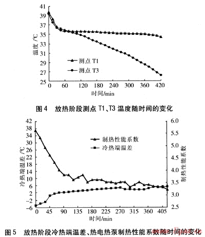 放熱階段冷熱端溫差、熱電熱泵制熱性能系數(shù)隨時(shí)間的變化見(jiàn)圖5。
