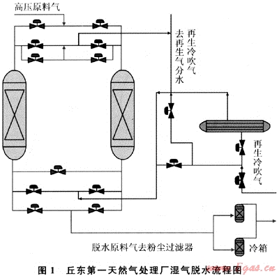 原料氣進裝置區(qū)后首先進入分離器除去游離水和機械雜質,然后在6.5MPa、25℃條件下進入分子篩干燥器,脫水后干氣露點小于-80℃,干氣進入旋風分離器除去分子篩粉末,最后進入輸氣管線。流程如圖1所示: