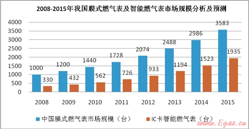 根據(jù)中國計(jì)量協(xié)會(huì)的相關(guān)數(shù)據(jù),我國目前約有100家燃?xì)獗韽S,2008年總產(chǎn)量為1000萬臺(tái),每年的復(fù)合增長率約為20%。具有中國特色的智能膜式燃?xì)獗?,以IC卡預(yù)付費(fèi)為主導(dǎo)產(chǎn)品,總量逐年上升,已占膜式燃?xì)獗砜偭康?0%以上。預(yù)計(jì)2015年我國燃?xì)獗砜偖a(chǎn)量為3583萬臺(tái),智能燃?xì)獗砜偖a(chǎn)量為1935萬臺(tái)。