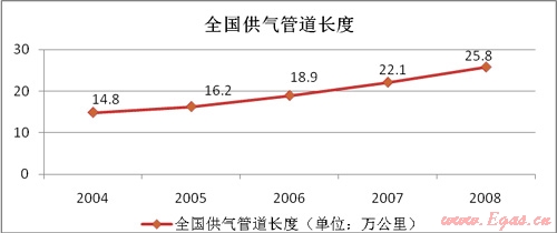 由于瓶裝氣由單獨(dú)的配套計(jì)量儀器,同時(shí)我國《城鎮(zhèn)燃?xì)饧夹g(shù)規(guī)范》規(guī)定使用管道燃?xì)獾挠脩魬?yīng)設(shè)置燃?xì)庥?jì)量裝置。因此,燃?xì)夤艿赖慕ㄔO(shè)將直接影響燃?xì)獗硎袌?chǎng)。根據(jù)《全國城市燃?xì)夤芫W(wǎng)改造規(guī)劃(2008-2010)》,1990年至2006年,城市燃?xì)庑袠I(yè)供求管道長度從2.4萬公里增加到18.9萬公里,增加了近7倍。2002年至2006年,城市燃?xì)夤艿滥暝鲩L1.42-2.74萬公里,平均增長率超過13%,而天然氣管道的平均增長率則超過20%。