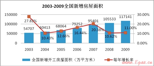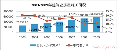 燃?xì)獗順I(yè)務(wù)與房產(chǎn)市場(chǎng)發(fā)展密切相關(guān)。2003年-2009年建筑房屋施工面積由259,377萬平方米增加到588,593萬平方米,年均增長14.6%。