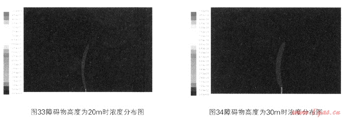 比較圖33和圖34可以看出,障礙物較高會對擴散的天然氣起到了進一步的抬升作用,使天然氣開始偏轉(zhuǎn)擴散的高度進一步升高。