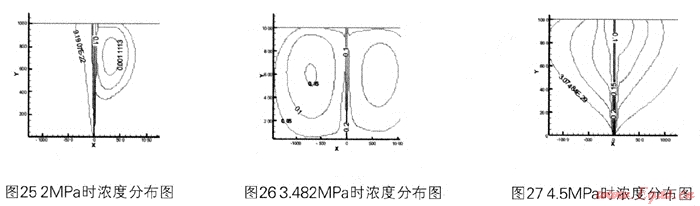 由圖19、20、21可以看出,隨著風速的從無到有,從小變大,濃度擴散區(qū)域也向右明顯偏轉(zhuǎn),并且擴散區(qū)域變大,當風速為10m/s時,擴散區(qū)域已經(jīng)超過了界定的區(qū)域。并且危險區(qū)域也隨風速變大而擴大,波及到下風向的近地面。