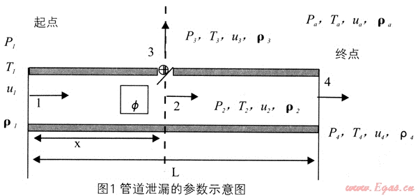 計算參數(shù)如圖1所示,管道起點為1,終點為4,長度為L,在距起點X處存在一點,發(fā)生泄漏。圖中:P1,T1,u1,ρ1表示管道起點的運行壓力、溫度、氣體速度以及氣體密度;P2,T2,u2,ρ2表示與泄漏孔中心在同一直線上的管道內(nèi)某點的運行壓力、溫度、氣體速度以及氣體密度;P3,T3,u3,ρ3表示泄漏點的運行壓力、溫度、氣體速度以及氣體密度;P4,T4,u4,ρ4表示這段管道終點處的運行壓力、溫度、氣體速度以及氣體密度;Pa,Ta,ua,ρs為管道外大氣的壓力,溫度,風速和空氣的密度。