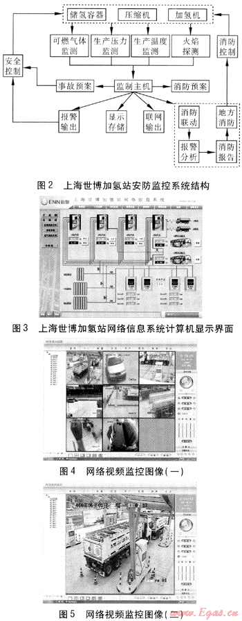 上海世博加氫站安防監(jiān)控系統(tǒng)結(jié)構(gòu)見(jiàn)圖2。系統(tǒng)的監(jiān)測(cè)范圍是容積為13m3的儲(chǔ)氫容器、4臺(tái)氫氣壓縮機(jī)、4臺(tái)加氫機(jī)及其周邊區(qū)域,監(jiān)測(cè)參數(shù)包括儲(chǔ)氫容器的壓力、壓縮機(jī)溫度、儲(chǔ)氫區(qū)及加氫區(qū)域氫氣泄漏量,儲(chǔ)氫區(qū)及加氫區(qū)20m范圍紅外、紫外火焰探測(cè)信息。系統(tǒng)共設(shè)8個(gè)可燃?xì)怏w泄漏點(diǎn),4個(gè)火焰探測(cè)點(diǎn),儲(chǔ)氫容器壓力、壓縮機(jī)溫度2個(gè)生產(chǎn)參數(shù)監(jiān)測(cè)點(diǎn),整個(gè)系統(tǒng)由監(jiān)控主機(jī)管理。其中,儲(chǔ)氫容器壓力、壓縮機(jī)溫度2個(gè)監(jiān)測(cè)參數(shù)取自站內(nèi)PLC控制系統(tǒng);可燃?xì)怏w泄漏監(jiān)測(cè)報(bào)警采用8臺(tái)氫氣可燃?xì)怏w濃度探測(cè)器,每臺(tái)加氫機(jī)上方各安裝1臺(tái)共4臺(tái),另外2臺(tái)安裝在壓縮機(jī)區(qū)域,2臺(tái)安裝在儲(chǔ)氫及卸氣區(qū)域;火焰探測(cè)報(bào)警共有4個(gè)火焰探測(cè)器,其中3臺(tái)為紅外、紫外火焰探測(cè)器,分別安裝在車(chē)輛加氫頂棚一側(cè)、卸氣區(qū)域及儲(chǔ)氫區(qū)域,另外1臺(tái)為三重紅外火焰探測(cè)器,安裝在車(chē)輛加氫頂棚另一側(cè)。根據(jù)監(jiān)測(cè)要求,圖2系統(tǒng)還配備了生產(chǎn)安全和消防安全控制裝置,以實(shí)現(xiàn)放散閥以及站內(nèi)緊急切斷閥的自動(dòng)或手動(dòng)控制。上海世博加氫站網(wǎng)絡(luò)信息系統(tǒng)計(jì)算機(jī)顯示界面見(jiàn)圖3,網(wǎng)絡(luò)視頻監(jiān)控圖像見(jiàn)圖4、5。