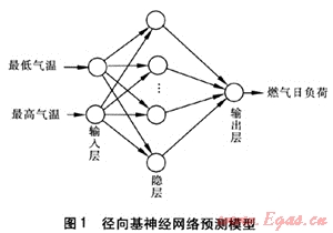 徑向基神經(jīng)網(wǎng)絡(luò)[2]是一種兩層前向型神經(jīng)網(wǎng)絡(luò),包含一個具有徑向基函數(shù)神經(jīng)元的隱層和一個具有線性神經(jīng)元的輸出層。在燃?xì)舛唐谪?fù)荷預(yù)測領(lǐng)域中,它以訓(xùn)練速度快、學(xué)習(xí)精度高的優(yōu)點開始逐漸嶄露頭角??紤]到燃?xì)馊肇?fù)荷受天氣狀況影響比較大,筆者以網(wǎng)絡(luò)的輸入為最低氣溫、最高氣溫,輸出為燃?xì)馊肇?fù)荷建立徑向基神經(jīng)網(wǎng)絡(luò)預(yù)測模型(見圖1)。