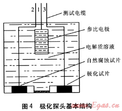 極化探頭由測試試片(自然腐蝕試片和極化試片)、參比電極和電解質組成,其基本結構見圖4。極化試片用和管道相同的材質制成,并用導線與管道相連,外部用絕緣體隔離,只留一個多孔塞子(滲透膜)作為測量通路,這樣的結構可使參比電極和燃氣管道之間的電阻壓降最小,直接測量無IR降電位,而不必斷開管道保護電流或間歇中斷與管道連接的電纜。只有將電位測試探頭處于與管道相同的土壤中,電位測試探頭才有效。