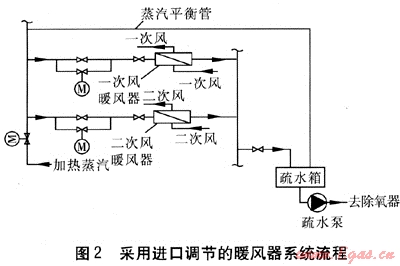 采用進口調節(jié)的暖風器系統(tǒng)流程見圖2。采用進口調節(jié)的暖風器系統(tǒng)在進口設有電動調節(jié)閥及旁通管道,通過調節(jié)進口閥門可調節(jié)加熱蒸汽流量,從而調節(jié)鍋爐排煙溫度。由于蒸汽平衡管的存在,在低負荷情況下,不但易引起水擊,導致振動,而且易使調節(jié)失靈,影響暖風器正常運行。