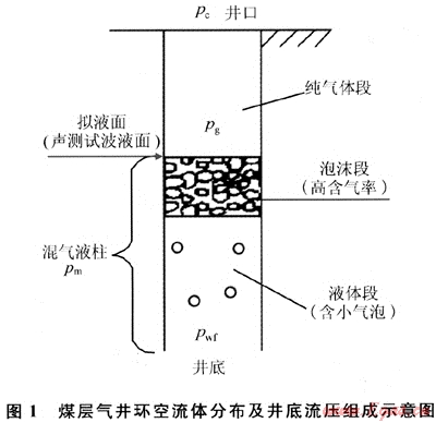 1) 煤層氣產出的油套環(huán)空中流體由上而下分為純氣體段、混氣液柱段,井底流壓為套壓、純氣柱壓力及混氣液柱壓力三者之和。