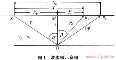 波場的反射與轉(zhuǎn)換是同時發(fā)生的,于共反射點處有一組不同偏移距縱波產(chǎn)生時相應有一組共轉(zhuǎn)換橫波與之相伴而生。縱波和轉(zhuǎn)換橫波同時向上傳播,到達地面后被儀器記錄下來。圖1為波的傳播路徑示意圖[2~5,8],界面深度為h,S為震源,由震源產(chǎn)生的下行P波遇到界面后,產(chǎn)生反射P波(P-P波)的同時,又轉(zhuǎn)換形成反射SV波(P-SV波),然后上行傳播到地面(圖1)。其中,R0是P-P波地面接收點,R1是P-SV波地面接收點,D是界面反射點位置,M是地面共中心點位置。