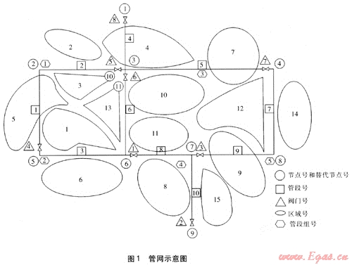 當(dāng)管網(wǎng)中管段或閥門發(fā)生故障、泄漏時(shí),借助GIS確定應(yīng)該關(guān)閉的閥門并給出因此而被影響或中斷供氣的供氣區(qū)域。為賦予GIS系統(tǒng)這種故障管段隔離決策功能,可以通過經(jīng)驗(yàn)的方法建立相應(yīng)的決策數(shù)據(jù)庫(kù),但為使決策過程科學(xué)化,應(yīng)該研究應(yīng)用于GIS的管網(wǎng)故障管段隔離決策算法(簡(jiǎn)稱管段隔離決策算法)。