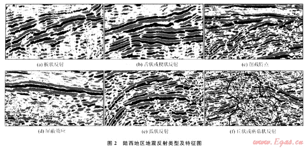 不同的地震相對應(yīng)一定的火山巖巖相,詳細(xì)劃分地震相有利于進(jìn)一步分析該地區(qū)火山巖巖相的分布。通過研究劃分出陸西地區(qū)石炭系火山巖地震反射特征主要有以下幾種:舌狀或楔狀反射、板狀反射、弧狀反射、丘狀或蘑菇狀等反射特征(圖2)。