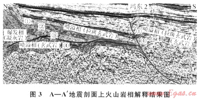 弧狀反射主要反映噴溢而出的熔巖流層,大多沿地形傾覆趨勢由高向低發(fā)展,反射同相軸呈弧形,由2到3個(gè)相位組成,表現(xiàn)為連續(xù)的強(qiáng)振幅和強(qiáng)反射,弧形下伏部位常由于屏蔽而表現(xiàn)為較弱的反射特征,一般比較雜亂或空白無反射(圖2-e),這主要是由偏基性的玄武質(zhì)巖漿形成的。玄武質(zhì)巖漿黏度較小,易于流動(dòng),噴發(fā)到地表后,往往朝著地形低洼處流動(dòng),因而玄武巖分布受古低洼地形控制較明顯。