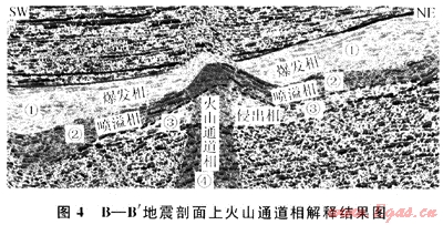 陸西地區(qū)某地震剖面(圖4)呈北東-南西向分布,地震剖面位置見圖5中B-B′。在該剖面中部可見一個(gè)內(nèi)部為雜亂和空白反射結(jié)構(gòu)的柱狀-蘑菇狀反射體,該反射體頂部具有明顯的不規(guī)則的蘑菇狀外形,下部為一個(gè)斷續(xù)-雜亂的柱狀反射體。其內(nèi)部反射特征為強(qiáng)振幅、低頻率的雜亂反射,內(nèi)部結(jié)構(gòu)常成丘狀的短反射,同相軸多產(chǎn)生扭曲,難以追蹤,視頻率較低,波軸變寬。在蘑菇狀反射體的兩端可見平行結(jié)構(gòu),頂端具有明顯的上超構(gòu)造,兩端具有披覆構(gòu)造。根據(jù)地質(zhì)和地震反射特征,筆者初步把該區(qū)域定為火山通道相的火山巖體。