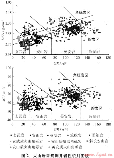 2) 建立火山巖地球物理測井響應(yīng)特征。首先完成了123塊樣品的全巖氧化物含量(特別是重礦物元素MnO、Fe203、TiO2等)和放射性元素(U、Th、K)含量分析,以針對性的實際資料證實了從基性到酸性火山巖U、Th、K的含量逐漸增大、放射性逐步增強以及重礦物含量逐漸減少的規(guī)律。然后以取心井為基礎(chǔ),用標(biāo)準(zhǔn)火山巖巖心標(biāo)定到測井曲線上,確定了不同巖性火山巖的典型測井響應(yīng)特征,強化了由基性巖到酸性巖自然伽馬值升高、密度降低、聲波時差值升高的基本規(guī)律。