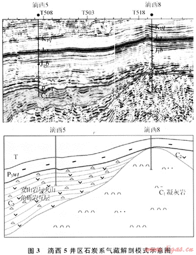 2006年通過井震結(jié)合對滴西5井區(qū)進行了解剖,從巖性巖相變化模式確定滴西5和滴西8井區(qū)石炭系為不同的巖相巖體,認為滴西5井以火山角礫巖為儲層,以安山巖為隔層,氣藏類型為受火山巖(角礫巖)巖性控制的層狀地層氣藏,而不是以前認識的構(gòu)造氣藏(圖3)。