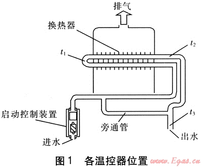 一般溫控器的設(shè)置位置從水路系統(tǒng)上考慮總是在換熱器換熱管的中端、換熱器換熱管末端、熱水器出水處(見圖1)。該3處溫度(以下簡(jiǎn)稱中端t1、末端t2和出水t3)之間存在著關(guān)聯(lián)性。