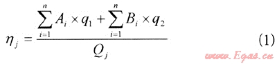 單個加氣站的日加氣負荷率:某個加氣站日負荷率(ηj)是指該加氣站售氣量與該加氣站供氣能力(Qj)的比值,該加氣站的售氣總量等于當日所有汽車加氣量的總和。q1、q2分別是公交車與出租車的日平均加氣量。