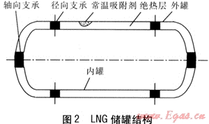 橇裝式LNG加氣站的LNG儲罐采用臥式、雙層金屬結(jié)構(gòu)的絕熱低溫儲罐,其結(jié)構(gòu)見圖2。內(nèi)罐一般采用奧氏體不銹鋼材料,如0Cr18Ni9、304等。外罐多采用普通低合金鋼,如16MnR。內(nèi)外罐之間的支承宜采用在低溫下既有較高強度又有較低熱導(dǎo)率的低溫玻璃鋼結(jié)構(gòu)。采用的絕熱方式主要有4種:堆積絕熱、真空粉末絕熱、高真空絕熱、高真空多層絕熱[6]。其中高真空多層絕熱以絕熱空間小、熱導(dǎo)率低、絕熱可靠等優(yōu)勢,在LNG儲罐上得到廣泛應(yīng)用,尤其適用于移動式低溫儲罐。對于高真空多層絕熱,維持夾層的真空度至關(guān)重要。首先,在抽真空時要確保腔內(nèi)材料充分放氣,并確保多層材料層間真空度達到規(guī)定要求;其次,可在腔內(nèi)放置常溫吸附劑,或采用添加吸附劑的層間隔熱材料,如填炭紙等,以吸附腔內(nèi)材料可能釋放出的少量氣體[7]。