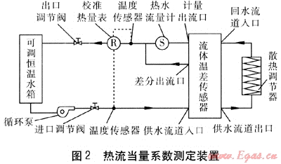 熱流當(dāng)量系數(shù)測定裝置見圖2??烧{(diào)恒溫水箱提供恒溫?zé)崴⒖烧{(diào)節(jié)供水溫度。進口調(diào)節(jié)閥兼有調(diào)節(jié)供熱介質(zhì)流量和進口壓力的雙重作用,散熱調(diào)節(jié)器的散熱速率可根據(jù)測試需要在一定范圍內(nèi)可調(diào)。校準(zhǔn)熱量表是整體計量精度達(dá)到CJ 128—2007《熱量表》[11]要求的高精度熱量表,其測定的用熱量被視為真值。校準(zhǔn)熱量表是電子型熱量表,它的兩個溫度傳感器跨接于供回水流道,實時測定供回水溫度。出口調(diào)節(jié)閥用于調(diào)節(jié)出口壓力。