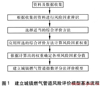 對城鎮(zhèn)燃氣管道進行風險評價,就是建立一套科學的評價體系,通過科學的評價方法獲得管道綜合的風險指標,這一指標應(yīng)能客觀地描述特定的燃氣管道的風險狀況。在現(xiàn)階段城鎮(zhèn)燃氣風險評價技術(shù)方法中,普遍采用的是指數(shù)評分法。應(yīng)用指數(shù)評分法建立城鎮(zhèn)燃氣管道風險評價模型基本流程見圖1。