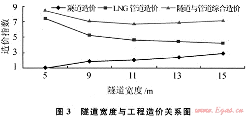 隧道橫斷面尺寸與LNG卸料管道U形膨脹彎的尺寸、數(shù)量的關(guān)系如下:膨脹彎的垂臂長(zhǎng)度越小,則隧道內(nèi)LNG管道的膨脹彎數(shù)量越多,隧道橫斷面尺寸較小,低溫管道的費(fèi)用則越高,隧道工程的造價(jià)越低;反之則相反。綜合比選結(jié)果參見圖3。