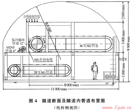 隧道內(nèi)包括管道區(qū)域和人員通道兩大區(qū)域。其中工藝管線包括46″(1168.4mm)的LNG卸料管道、28″(711.2 mm)的BOG回氣管道、12″(304.8mm)的保冷循環(huán)管道和4″(101.6mm)的排氣(VENT)管道,公用系統(tǒng)管道包括16″(406.4mm)的消防海水管道及其他小口徑的氮?dú)?、儀表風(fēng)、水管道及儀表電纜、電力電纜(參見圖4)。低溫管道均采用焊接連接,不設(shè)任何閥門或法蘭。此外,作為防冷凍保障方案,在LNG卸料管道底部的管架上,設(shè)置M1電纜進(jìn)行電伴熱,用于隧道通風(fēng)換熱不足情況下的安全保障,其設(shè)計(jì)能力為18.0W/m。