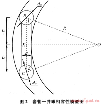 在采用常規(guī)下套管方法時(shí),以套管串在井眼出現(xiàn)“硬卡”問題為臨界條件,建立套管、井眼幾何相容性模型(見圖2),其中B、C兩點(diǎn)是約束點(diǎn),代表套管接箍或扶正器,兩個(gè)支點(diǎn)間是套管柱。在圖2中,R是長度為L(L=L1+L2)的套管柱可通過的最大井眼曲率半徑,在井眼直徑(Ds)、上下兩支點(diǎn)直徑ds1、ds2,套管外徑(d)給定前提下,可推導(dǎo)出套管柱所能通過的最大井眼曲率(K=1/R)。
