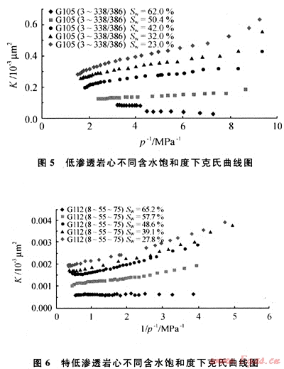 筆者的實驗研究結果與Rose得到的結論完全一致,就是氣體在低滲透巖心中的克氏效應隨含水飽和度的增加而明顯減弱,其實驗結果見圖5、6。