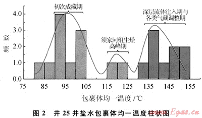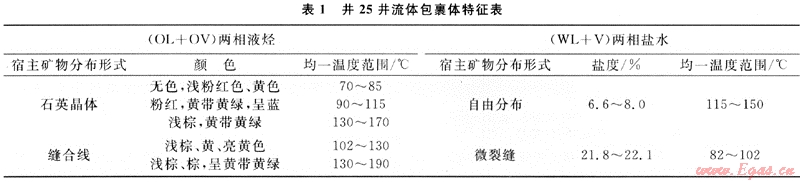 從古地溫梯度圖可以看出,井25井須家河組地層在演化過程中最高溫度為135℃,而包裹體均一溫度存在的第三個范圍,即130~155℃部分超出了須家河組的古地溫范圍。此現(xiàn)象應(yīng)是由于外來深層高溫流體侵入造成的。這與前述的根據(jù)包裹體鹽度較低所推測的存在高演化油氣充注的結(jié)果一致。由此可見須家河組儲層接受了深層流體及烴源的貢獻(xiàn),推測可能發(fā)生在喜山運動期,也即四川盆地普遍存在的天然氣重新分配與調(diào)整期。因此高溫流體對應(yīng)這一成藏期。