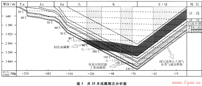 與筆者所恢復(fù)的井25井古地溫梯度和埋藏史及生烴史對照,可得到井25井成藏期次分析圖(圖3)。由圖2可知,在古地溫為90℃左右時,須家河組處于白堊系地層沉積初期,此階段須家河組烴源巖成熟度Ro為0.5%~0.7%,為生烴早期階段,煤系烴源巖以生成部分液態(tài)烴和濕氣為主,屬于低演化系列烴類,絕對數(shù)量有限,但可優(yōu)先占據(jù)儲層原生孔隙,且因儲層巖石沒有完全壓實而物性較好,利于烴類高效運聚,為初次成藏期。第二階段均一溫度為115~125℃,對應(yīng)白堊系地層沉積后期,烴源巖成熟度(Ro)為0.9%~1.0%以上,進(jìn)入須家河組生烴高峰期。由于樣品包裹體分布不均等因素,使得在分析的樣品中所測得的該期包裹體均一溫度數(shù)量不多,但這是須家河組烴源巖大量生烴階段,以生成煤成氣為主,氣體干濕度適中并含少量凝析油。因此應(yīng)屬于須家河組烴源的主要成藏期。