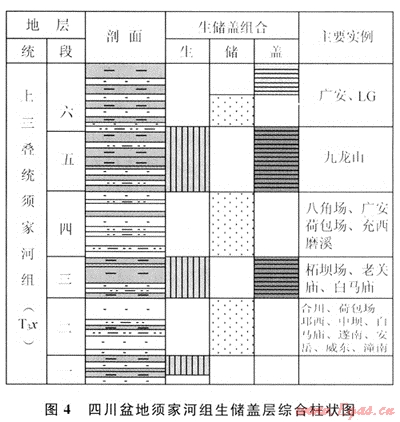 四川盆地上三疊統(tǒng)須家河組是在中三疊世雷口坡期侵蝕面基礎上沉積的典型陸相煤系碎屑巖沉積,縱向上一般可細分為6個巖性段(圖1),其中,須一、須三、須五段以泥巖、頁巖為主夾薄層粉砂巖、碳質頁巖和煤線,為湖泊沼澤環(huán)境沉積的產物,形成的煤系烴源巖大面積分布;須二、須四、須六段以大型三角洲沉積的灰色、細-中砂巖為主,形成的水下分流河道砂體大面積分布。生、儲層的交互發(fā)育構成了須家河組“三明治”結構的良好空間配置關系(圖4),有利于大面積成藏,提高了聚集效率。