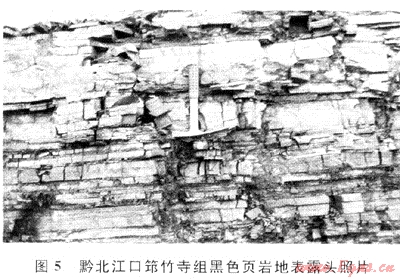 研究區(qū)下寒武統(tǒng)黑色頁巖主要發(fā)育于川南、黔北及黔東北-湘鄂西一帶,均以濱海沼澤及淺水缺氧停滯濱淺海沉積為主,與最大海泛面相對應(yīng)的低能黑色頁巖(包括碳質(zhì)頁巖和硅質(zhì)頁巖)相吻合,為克拉通基底盆地內(nèi)的第一套區(qū)域性烴源巖(屬于腐泥型有機(jī)質(zhì)類型,見表1),現(xiàn)今埋深在2000~4000m之間(圖4),總有機(jī)碳含量平均為2.74%[20]。其中,張家界實(shí)測總有機(jī)碳含量平均為7.7[21],Ro值平均為3.16%,處于高過成熟階段[22]。在野外實(shí)測剖面和井下巖心觀察中均發(fā)現(xiàn)了十分發(fā)育的裂縫(圖5),經(jīng)對研究區(qū)內(nèi)的老井進(jìn)行復(fù)查(威5、威18等井),已在該套頁巖中發(fā)現(xiàn)普遍存在的氣顯異常[23、24]。