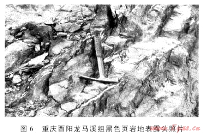 區(qū)內(nèi)上奧陶統(tǒng)-下志留統(tǒng)筆石頁巖普遍發(fā)育且分布穩(wěn)定,深灰色、黑色碳質(zhì)、硅質(zhì)泥頁巖埋深在1500~4000m之間,有機(jī)質(zhì)類型均屬腐泥型,殘余總有機(jī)碳含量平均為2.28%[20],目前多處于高成熟演化階段[22],成熟度平均值均大于1.5%。在最近完鉆的探井中(如丁山1井、建深1井龍馬溪組),氣顯示(井涌及氣測等)異常在鉆井過程中頻繁出現(xiàn)[11、26]。依據(jù)頁巖類型和礦物學(xué)特征分析表明:該套頁巖具有脆性巖石組分[26],野外實(shí)測剖面中可見風(fēng)化的頁巖破碎帶(圖6),在鉆井巖心中也發(fā)現(xiàn)了十分發(fā)育的高角度微裂縫,指示該區(qū)頁巖易于發(fā)生脆性裂縫。