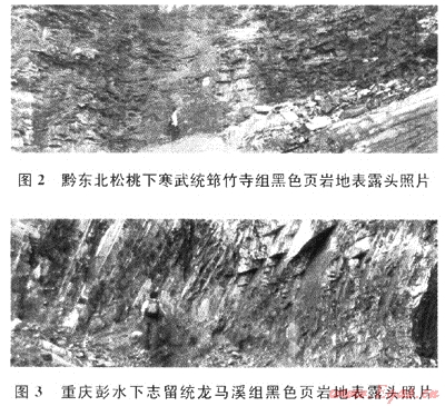從地表頁巖出露情況分析認(rèn)為,筇竹寺組黑色頁巖(圖2)主要分布于川南的宜賓-瀘州、川東的達(dá)州-墊江-長壽一帶和黔北的金沙-江口-松桃一線以南地區(qū),渝東南的秀山、酉陽和湘鄂西的龍山、咸豐等地區(qū)也較為發(fā)育;五峰組-龍馬溪組筆石頁巖(圖3)主要發(fā)育于盆地邊部且相對穩(wěn)定,在川南的宜賓、瀘州、南川、綦江,川東的石柱、涪陵,渝東南的武隆-彭水-黔江,黔東北的道真-德江及鄂西的利川-咸豐-來鳳一帶發(fā)育完整,而在盆地腹部的樂山-龍女寺一線以西北,由于后期構(gòu)造抬升剝蝕而缺失。以上2套黑色頁巖熱演化程度普遍較高且已被證實(shí)為重慶及其周緣地區(qū)海相地層的主要?dú)庠磶r[16]。