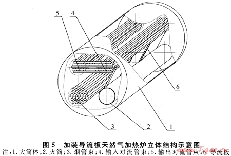 為加強(qiáng)天然氣加熱爐大筒體內(nèi)有效傳熱流場(chǎng)的組織,提出一種大筒體內(nèi)加裝導(dǎo)流板組織熱流場(chǎng)的改良結(jié)構(gòu)(國(guó)家發(fā)明專利:ZL200810036446.4):在筒體上部的冷卻受熱面和筒體下部的加熱受熱面之間,沿簡(jiǎn)體軸向設(shè)置導(dǎo)流板,導(dǎo)流板的長(zhǎng)度可按實(shí)際需要沿筒體軸向分割成幾塊,這樣便于加工安裝和提高使用效果,如圖5所示。