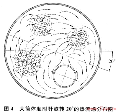 針對(duì)天然氣加熱爐大筒體內(nèi)無(wú)法形成有效傳熱流場(chǎng)的缺點(diǎn),首先提出一種旋轉(zhuǎn)型圓筒式天然氣加熱爐(國(guó)家實(shí)用新型專利:ZL200820057571.9):將大筒體內(nèi)對(duì)稱布置的加熱受熱面(即火筒和煙管束,以及冷卻受熱面)旋轉(zhuǎn)適當(dāng)?shù)慕嵌?,使加熱受熱面盡可能置于較低的位置[8](如圖4所示),這時(shí)大筒體內(nèi)溫度最高的火筒位于筒體的最下部,形成一股較強(qiáng)向上的熱壓,增大引起自然對(duì)流的動(dòng)力,由于火筒、煙管束和對(duì)流管束內(nèi)的流體存在溫差,促使大簡(jiǎn)體內(nèi)中間載熱介質(zhì)形成順時(shí)針循環(huán)順暢的熱流場(chǎng),消除大筒體底部的“死角”,達(dá)到強(qiáng)化傳熱,提高效率的目的。研究表明:該旋轉(zhuǎn)角度以20°為最佳[9],旋轉(zhuǎn)太小,達(dá)不到增大動(dòng)力的目的;旋轉(zhuǎn)太大,會(huì)導(dǎo)致煙管束與輸入對(duì)流管束處于同一水平位置,反而破壞了順暢流場(chǎng)的形成。