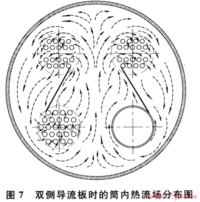 實(shí)際應(yīng)用中,亦可布置雙側(cè)導(dǎo)流板(圖7),火筒和煙管束周圍的上升流在雙導(dǎo)流板的引導(dǎo)下,分別流經(jīng)各自上方的對(duì)流管束放熱后,向下回流到火筒和煙管束附近,從而在大筒體內(nèi)形成了更有效的雙循環(huán)流場(chǎng)。