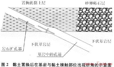 黏土置換技術是將砂卵礫石層剝離開挖出來以后,用黏土進行分層碾壓回填,在回拖過程中要不斷排水,保證黏土回填密實。如果排水不暢,黏土回填過程中很容易形成橡皮土,當鉆進導向孔或擴孔時,鉆頭或擴孔器經(jīng)過該部位時,鉆頭和擴孔器在自身重量的作用下形成嚴重的折角(DL)(俗稱“狗腿值”,英文名字Dog Leg),如圖2所示。另外,黏土在回填夯實過程中要嚴格控制含水量,含水量過高或過低都不能達到良好的夯實效果。夯實后黏土的單軸抗壓強度要與下伏基巖的抗壓強度相近,才能保證在鉆進導向孔或擴孔過程中不會出現(xiàn)較大的DL值。該方法施工難度大,技術控制要求嚴格。事實上,不論如何夯實黏土層,都很難消除黏土與下伏基巖之間出現(xiàn)抗壓強度的變化。