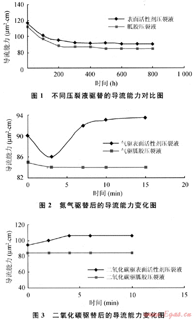 將實(shí)驗(yàn)結(jié)果繪制成圖1、2,、3。從圖中可以看出,無(wú)論采用哪種液體,裂縫導(dǎo)流能力開(kāi)始下降較快,200h后逐漸接近平緩,兩種液體為介質(zhì)的裂縫導(dǎo)流能力相差不大,胍膠壓裂液為介質(zhì)的裂縫導(dǎo)流能力稍微低些。隨后進(jìn)行氮?dú)怛?qū)動(dòng)實(shí)驗(yàn),氮?dú)怛?qū)動(dòng)胍膠壓裂液,開(kāi)始其裂縫導(dǎo)流能力略有下降,但3min后基本保持不變。而氮?dú)怛?qū)動(dòng)表活劑壓裂液時(shí),裂縫導(dǎo)流能力開(kāi)始略有下降,但是2min后導(dǎo)流能力開(kāi)始上升,6min后超過(guò)初始值,15min的實(shí)驗(yàn)時(shí)間,裂縫導(dǎo)流能力保持升高趨勢(shì)。分析原因,開(kāi)始下降是由于氣體驅(qū)動(dòng)黏性液體開(kāi)始有阻力造成壓差較大,而含有表活劑壓裂液的支撐裂縫在驅(qū)通之后,新型壓裂液體能夠自由流動(dòng),縫端壓差逐漸減小,裂縫導(dǎo)流能力增大。第三步如圖1~3所示,繼續(xù)通入二氧化碳后,含有胍膠壓裂液的裂縫導(dǎo)流能力基本上不變,而含有新型表活劑壓裂液的支撐裂縫,其導(dǎo)流能力卻在4min之內(nèi)增加而后保持不變,二氧化碳酸性氣體使殘存著支撐裂縫之間的表活劑壓裂液破膠,減少了裂縫的流動(dòng)壓差。