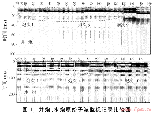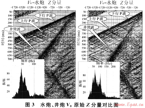 一般情況下,使用多級檢波器采集VSP數(shù)據(jù)時,“井炮”激發(fā)的能量比“水炮”強、一致性比“水炮”好,主頻比“水炮”高、抗低頻的能力較“水炮”強,變“水炮”為“井炮”是提高原始資料品質(zhì)的一種有效途徑。