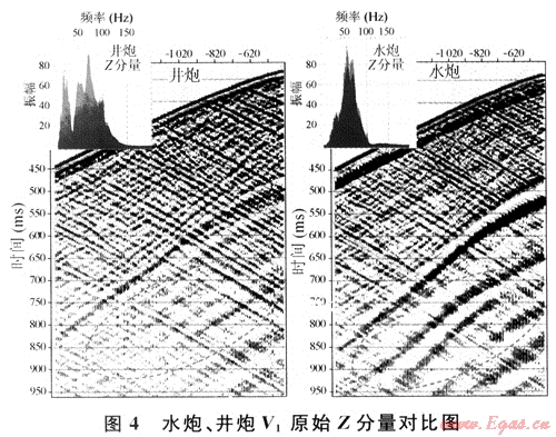 圖3為井炮、水炮激發(fā)的零井源距原始Z分量比較圖,從圖中可以看到以下特征:①兩個Z分量記錄初至都起跳干脆,時序規(guī)則,符合正常變化規(guī)律;②兩個Z分量波組特征明顯,波場信息豐富,清晰可見多套上行波和下行波;③記錄上都出現(xiàn)了井筒波、高頻干擾等;④從粉紅色箭頭內(nèi)的上行縱波可以看出,在水炮記錄上表現(xiàn)為上行縱波能量隨著偏移距的增大而逐漸減弱,到最后完全淹沒在噪聲中,而在井炮記錄上表現(xiàn)為能量隨著偏移距的增大基本不變,這說明井炮能量的穩(wěn)定性比水炮的好;⑤淺綠色橢圓內(nèi)的波組能量在水炮記錄剖面上表現(xiàn)為隨著深度的加深而逐漸減弱,到最后完全淹沒在噪聲中,而在井炮記錄剖面上表現(xiàn)為隨著深度的加深也有減弱的趨勢,但比水炮減弱的速度慢得多,在1000ms處還能清楚地看到上行縱波的能量;⑥水炮Z分量原始資料的主頻在48Hz左右,優(yōu)勢頻帶為30~80Hz,井炮Z分量原始資料的主頻在51Hz左右,優(yōu)勢頻帶為30~100Hz。由于此井水炮震點處的淺層堆積物少,1m以下就為致密砂巖,因此二者的主頻都較高,完全超過了地面地震資料的主頻;⑦井炮激發(fā)抗井筒波的能力比水炮激發(fā)強。