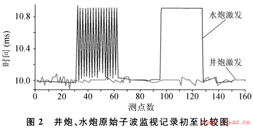 初至?xí)r間是VSP資料所包含的一個重要參數(shù),它是從VSP資料中提取地層速度信息以及VSP波場分離的前提。從理論上講,震源子波的初至?xí)r間是嚴(yán)格一致的。而實際上并非如此,炸藥震源的時間不一致現(xiàn)象更為明顯。其原因主要是炮井位置的改變、激發(fā)深度的變化、井中激發(fā)環(huán)境的變化等。對本次試驗的水炮、井炮激發(fā)來說也不例外。每炮間初至的變化幅度越小則說明震源的一致性越好。圖2為水炮、井炮子波監(jiān)視記錄的初至比較圖。從圖中可以看出,井炮變化幅度在0.2ms左右,而水炮的變化幅度在1ms左右,這說明井炮的初至一致性比水炮的一致性好。