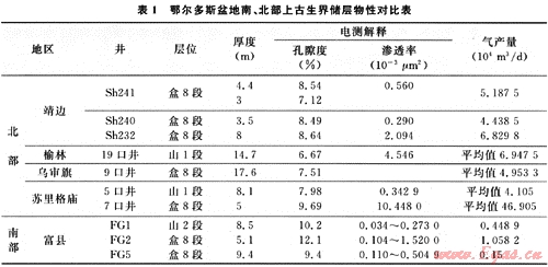 經(jīng)過對盆地南部上古生界砂體展布的重新認識,認為盆地南部與北部相比具有相近的儲集條件。厚度上,鄂爾多斯盆地南部山西組、石盒子組與北部氣田山西組、石盒子組儲層厚度大致相當;孔隙度上(表1),鄂爾多斯盆地北部氣田的孔隙度普遍小于100,而南部富縣地區(qū)山西組、石盒子組儲層的孔隙度相比略高,一般大于或等于10%;滲透率上,北部氣田的滲透率變化比較大,低的可以到0.29×10-3μm2,高的可以超過10×10-3μm2,南部地區(qū)滲透率更低,盒8段鉆遇最高只有1.52×10-3μm2。這種低滲透率可能是在寬緩的構(gòu)造背景下,天然氣成藏之后再次成巖形成的[13],經(jīng)工藝改造可以改善其儲集條件。