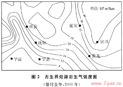 鄂爾多斯盆地上古生界烴源巖生烴模擬計算[11],成熟烴源巖(Ro>1.25%,達到生烴高峰)面積達18×104km2,在盆地內(nèi)廣泛分布。盆地南部煤系氣源巖的生氣強度為(5~40)×108m3/km2(圖2),其中,環(huán)縣-慶陽-黃龍一線北東方向生氣強度都超過20×108m3/km2。