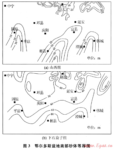 鄂爾多斯盆地下石盒子組主要發(fā)育三角洲平原和三角洲前緣砂體(圖3-b),砂體厚度較大,在30~100m之間,北部砂體分布范圍大,從北部剝蝕區(qū)一直延伸到盆地中南部的環(huán)縣-延安一線。南部相對局限,經(jīng)渭北隆起到達固原-慶陽-富縣一線。南部砂體在東西上連成一片,總體來看亦具3個物源,由西向東依次為平?jīng)錾绑w、彬縣-富縣砂體和澄城-韓城砂體。砂體南北延伸距離較小,砂體厚度為40~80m。